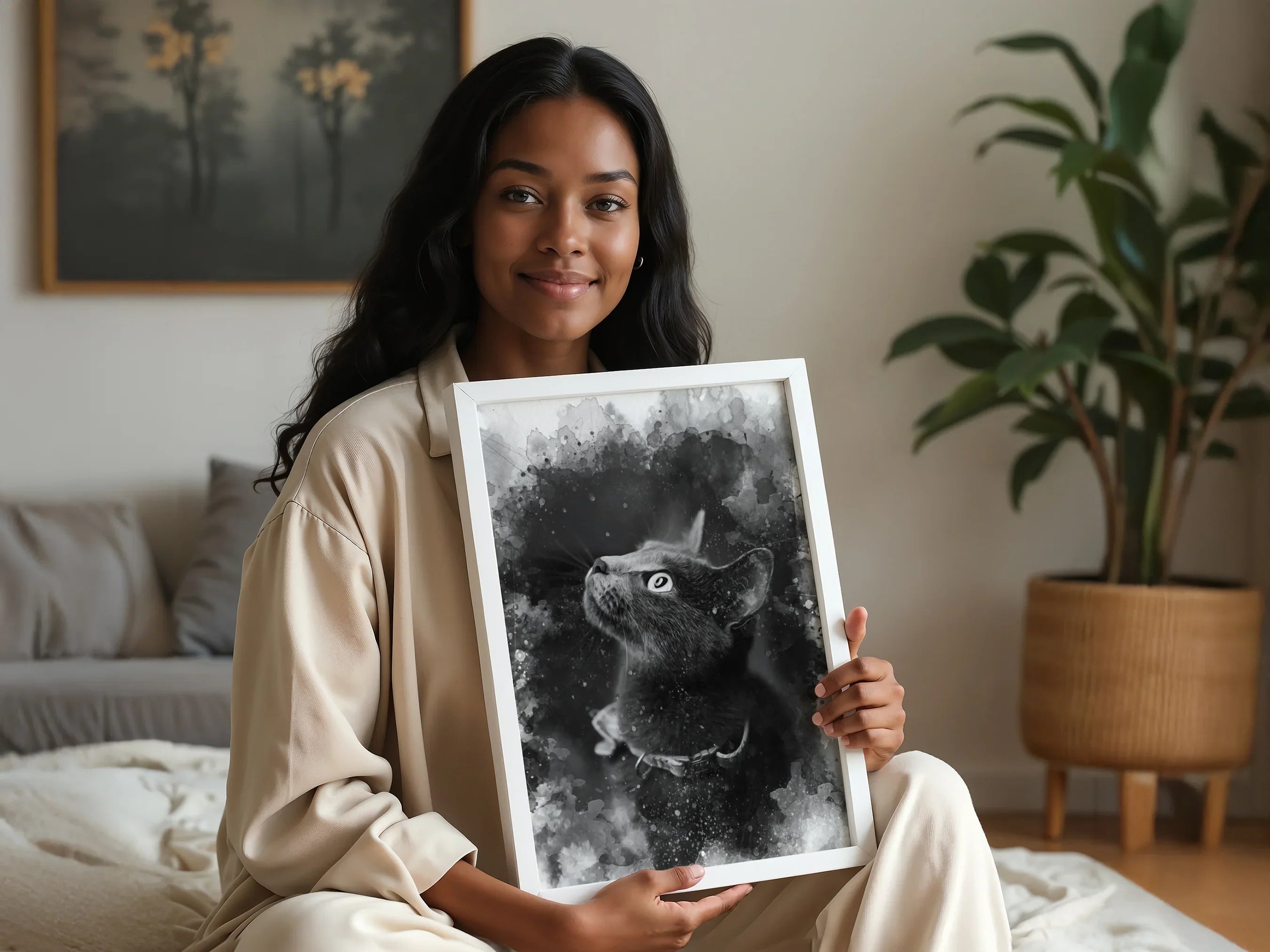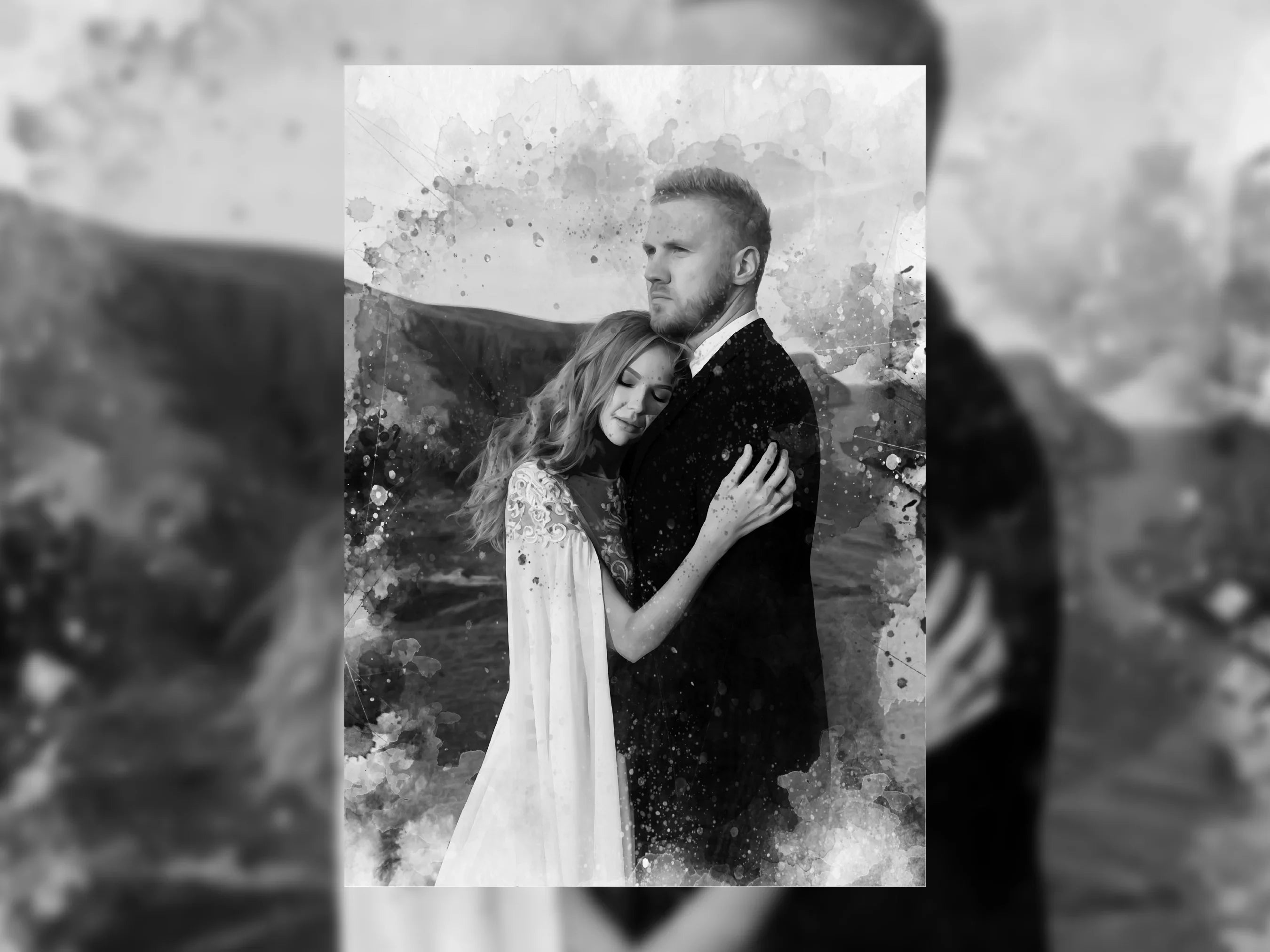 This personalised watercolour-style wedding portrait captures one of your most emotional moments and transforms it into a meaningful piece of decor. Using your photo, we create a custom design in monochrome tones with a romantic, artistic watercolour splash effect.