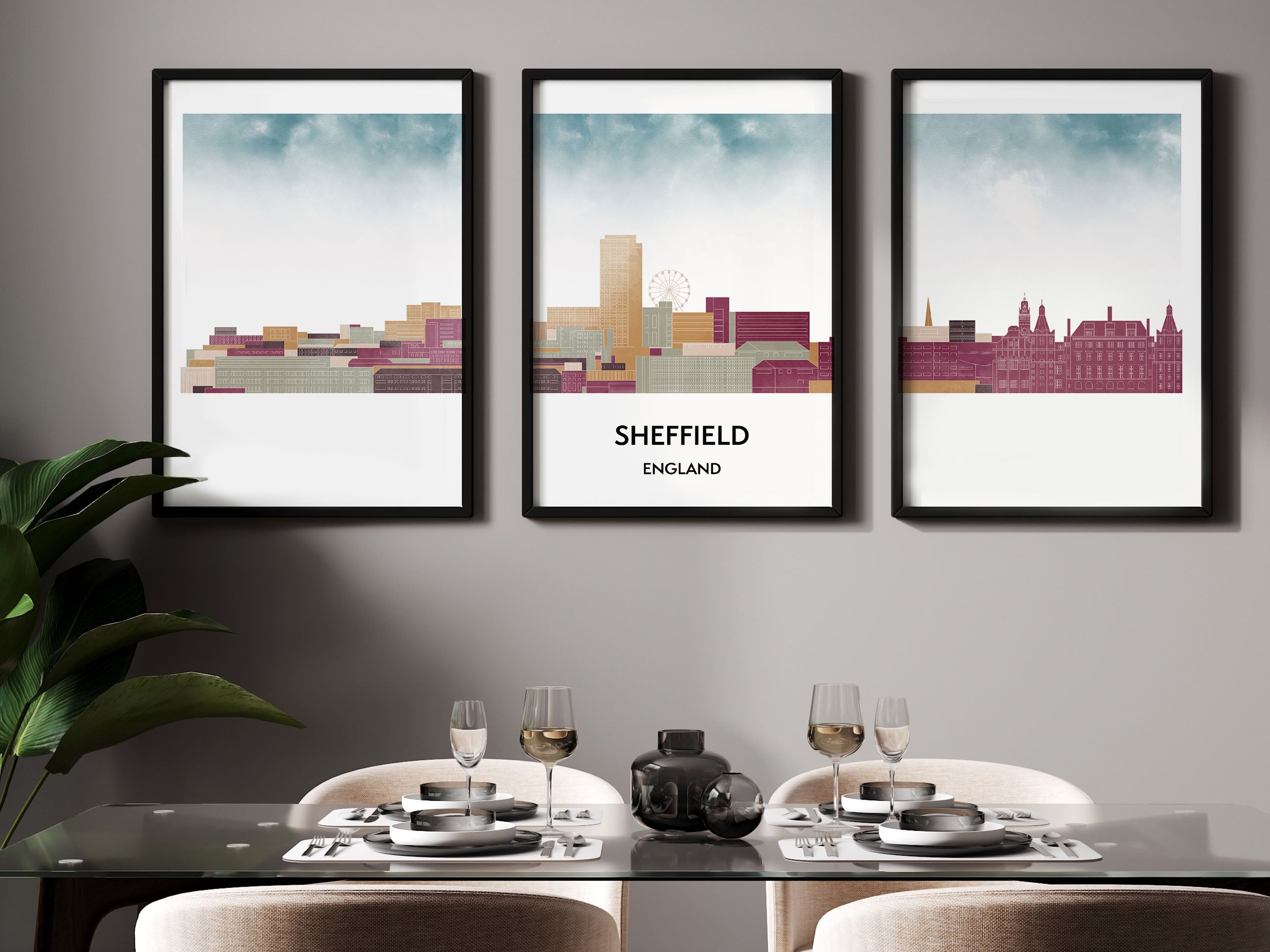 Sheffield Silhouette Triptych in Watercolor Style, Sheffield Skyline Poster, Sheffield Set of 3 Posters Poster for Living Room - Urban Charm Captured in Art - Capturing Urban Beauty in Detail - Architectural Beauty Captured